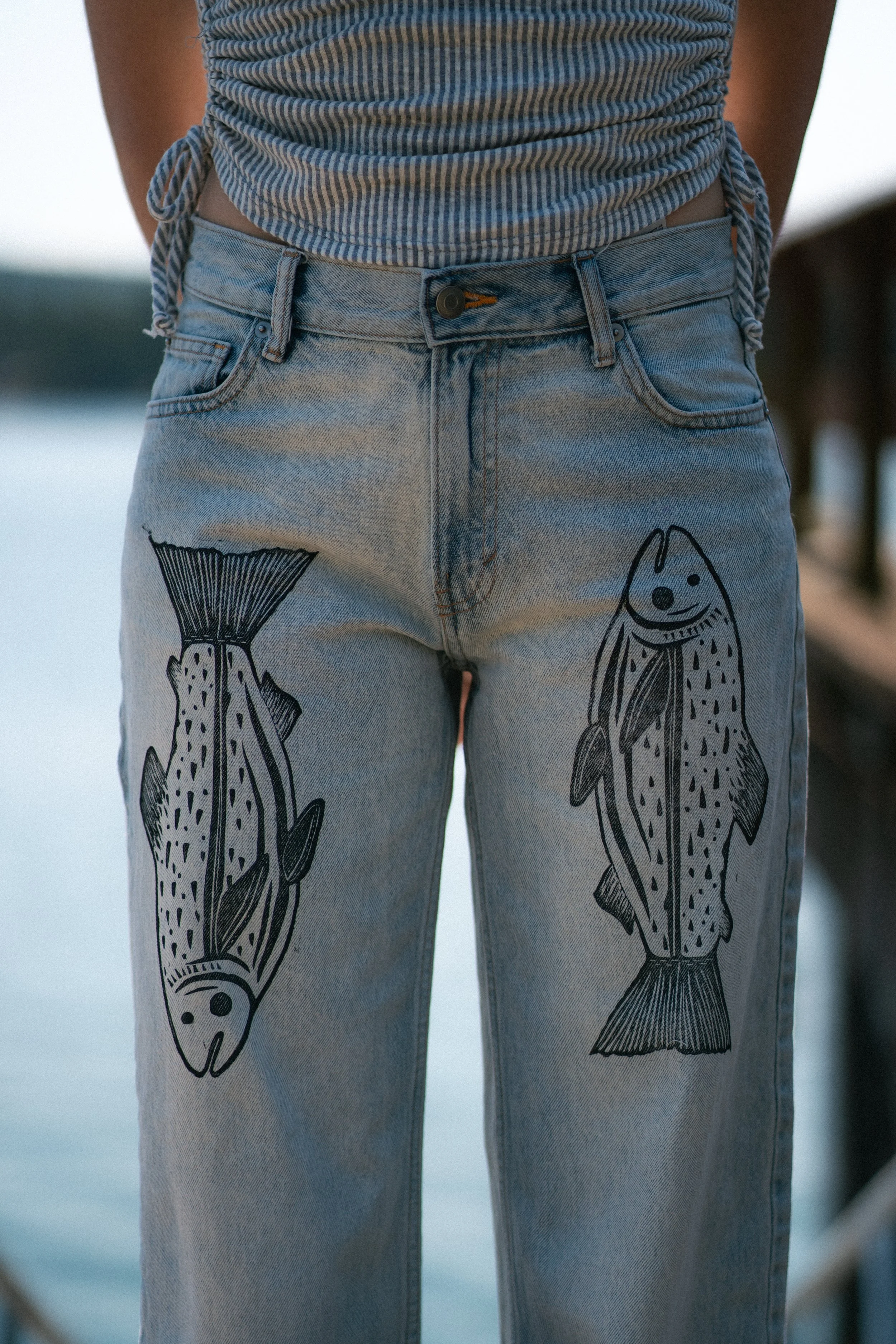These second hand items of clothing are being given a new life through handprinted fish & fern designs. Every fish and fern is place with the shape of the garment and the movement of the wearer in mind, with a focus on ensuring that the fish and ferns flow with the daily life of the wearer. Each clothing piece is entirely unique, and the entire process of creation is done locally by Jasmine Rodman.